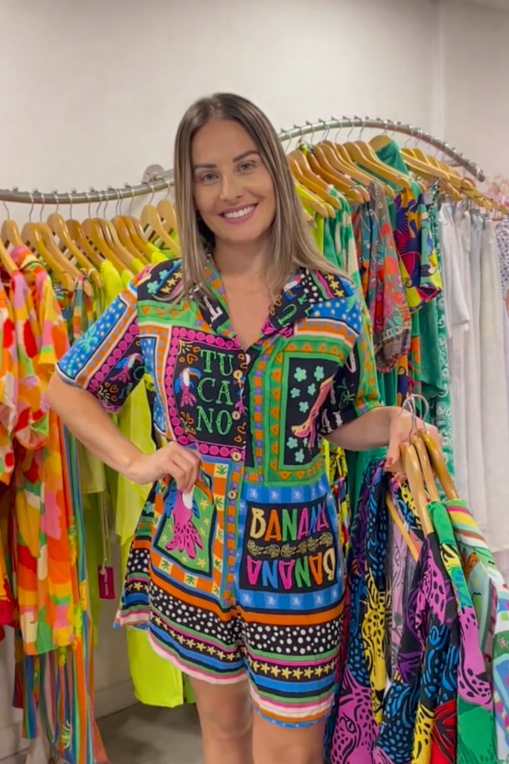 O Macaquinho Banana Split é a escolha ideal para quem busca leveza, conforto e um visual moderno com toque divertido e sofisticado. Com estampa Banana Split vibrante e cheia de personalidade, a peça transmite alegria, frescor e estilo, criando produções femininas, atuais e cheias de charme.